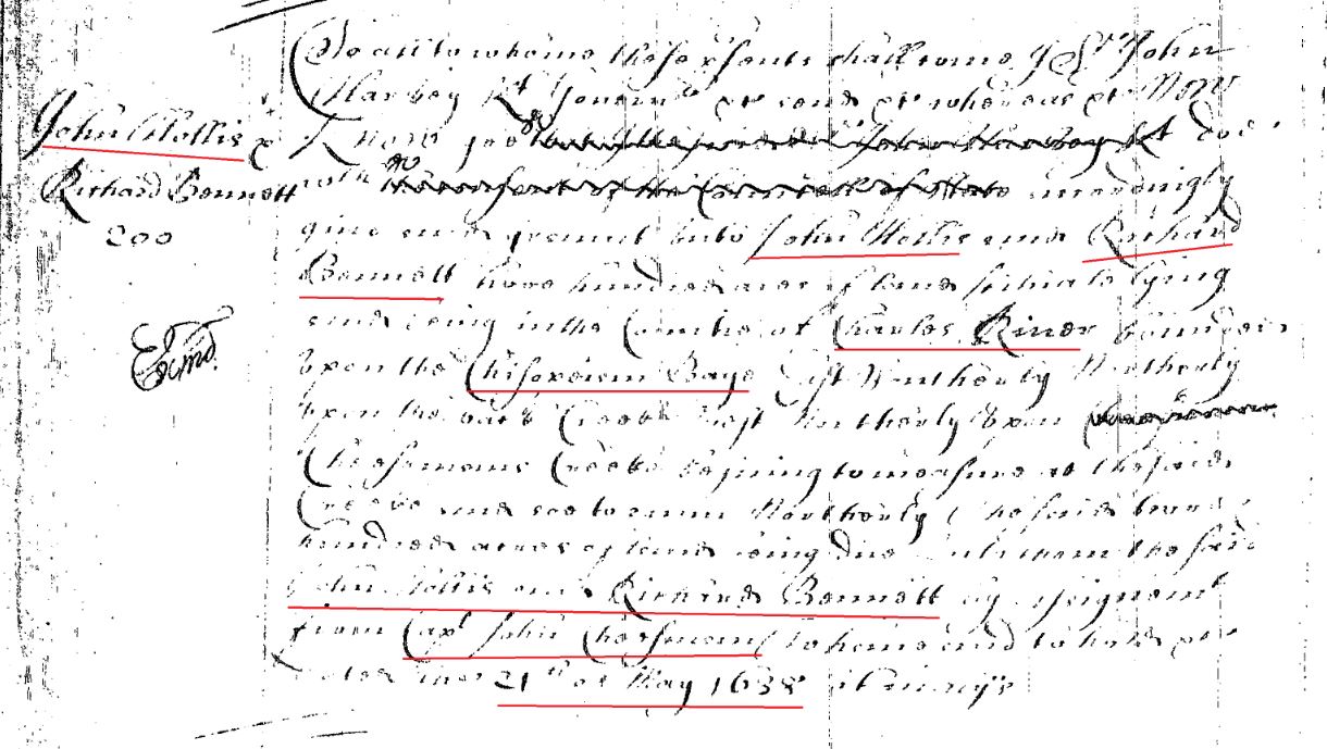 1638 May 21: JOHN HOLLIS & RICHARD BENNETT, 200 acs. Charles River Co., May 21, 1638, Page 558. Upon Chisopean Bay. Due by assignment from Capt. John Cheesman. Cavaliers and Pioneers, a Calendar of Virginia Land Grants 1623-1800, V. I. Pg 119.