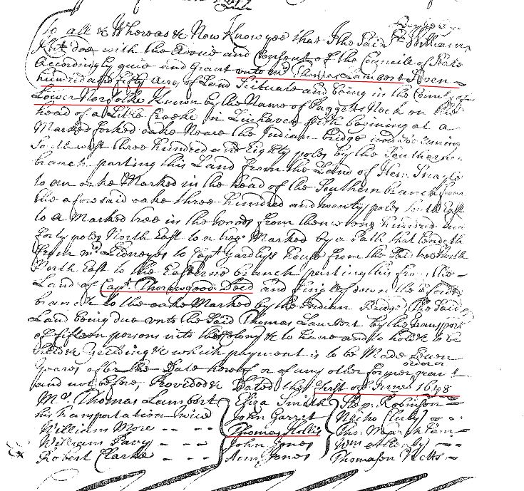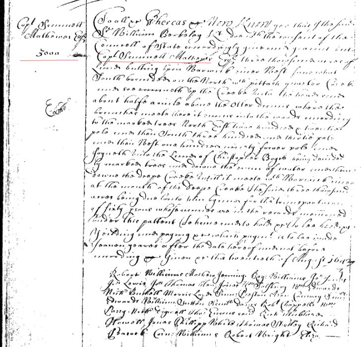 1656 Nov 30: LT. COL. NATHANIELL POPE, 1,050 acs. Westmoreland Co., 30 Nov. 1656, 50 acs. Nly. upon a branch of the head of Hollis’ Cr. at Apamatockes, Ely. upon land of Major John Hollis; & 1000 acs.