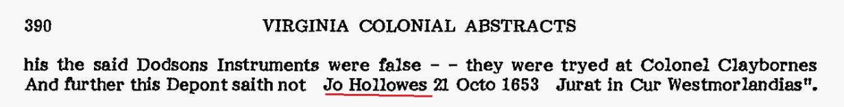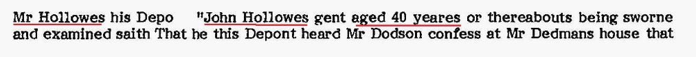 1657 Aug 14: Major John Hollowes aged fortie one yeares or thereabout Sworne and Examined in open Court Sayth that when John Dandy Came over Patomack River to this Deponents house, This Deponent and the Said Dandy did go to the house of Mr Bradhorst, and when I this Deponent and the Said Dandy Came there, the Said Dandy did Say that it was reported that he the Said Dandy had killed his man Harry a weeke before he did kill him And that he had Escaped away, and was Come to put himself upon a Tryall in Virginia a Concerning the Death of his Said Servant. Jo: Hallowes, in St. Marys, Maryland.