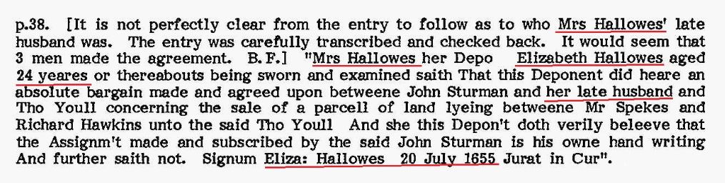 1655 July 20: ”Mrs Hallowes her Depo Elizabeth Hallowes aged 24 yeares or thereabouts being sworn and examined saith That this Deponent did heare an absolute bargain made and agreed upon betweene John Sturman and her late husband and Tho Youll concerning tile sale of a parcell of land lyeing betweene Mr Spekes and Richard Hawkins unto the said Tho Youll And she this Depon’t doth verily beleeve that the Assignm ‘t made and subscribed by the said John Sturman is his owne hand writing And further saith not. Signum Eliza: Hallowes 20 July 1655 Jurat in Cur”. (Note: The language used does not clearly identify who Elizabeth Hallowes is saying her prior husband is. But in reading this document, her testifying about recognizing John Sturman’s handwriting verifies that John Sturman must have been her prior husband. There would be no other need for her testimony here, other than to say that she recognized the handwriting of her deceased husband, John Sturman).