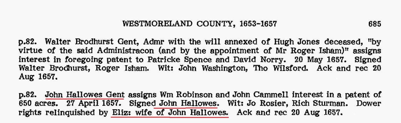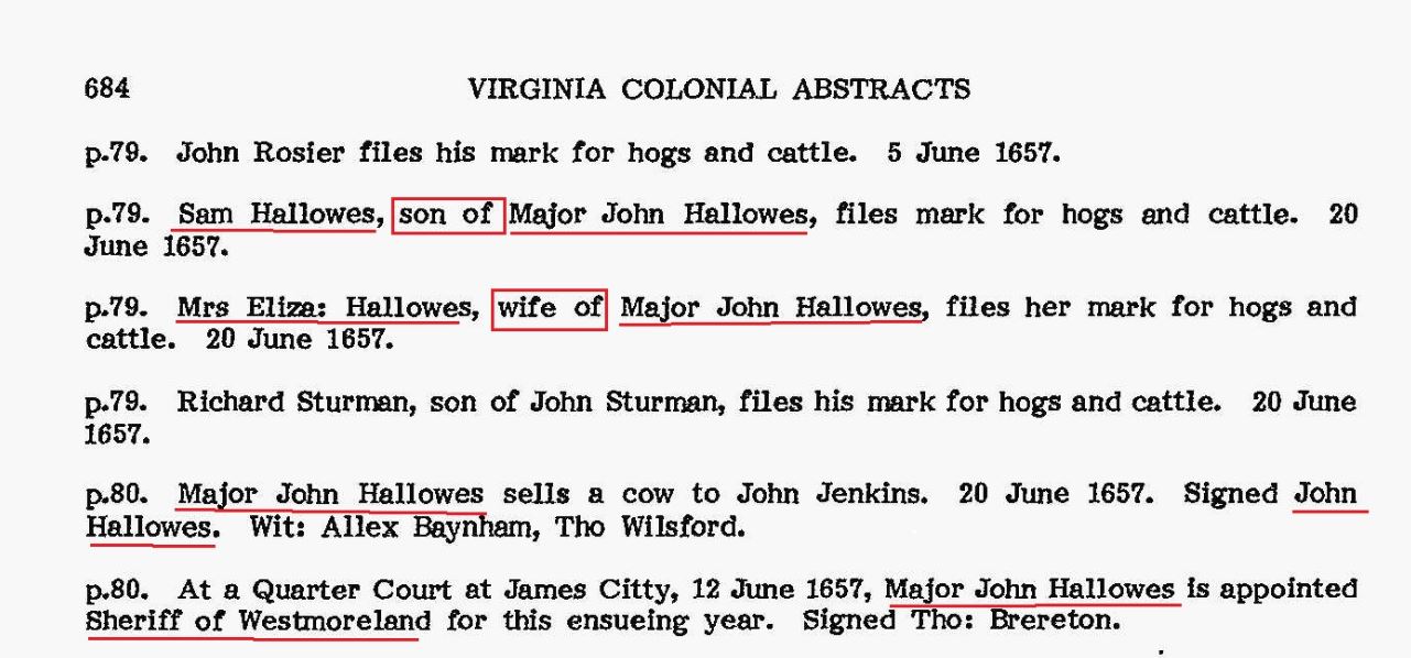 (Appointed Sheriff of Westmoreland Co, Va): 1657 June 12: p.80. Quarter Court at James Citty, 12 June 1657, Major John Hallowes is appointed Sheriff of Westmoreland for this ensueing year. Signed Tho: Brereton.