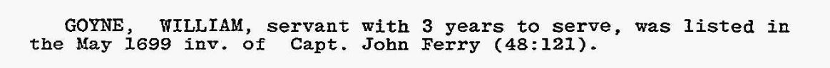 William Goyne b. abt 1675-85 – servant to Capt John Ferry in Baltimore Co, MD – with 3 years to serve in May of 1699. (Note: Possibly same William Going b. abt 1682 in Stafford Co, Va).
