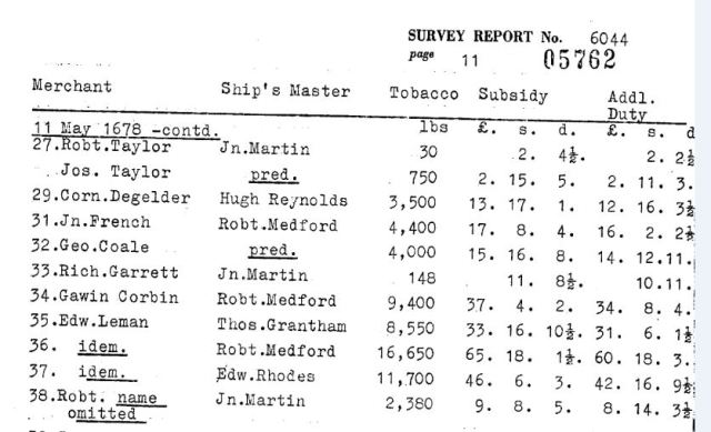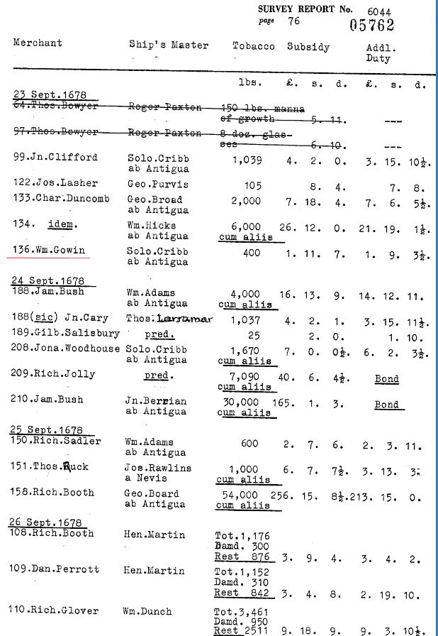 1678 – William Gowin is listed as a merchant moving goods between Virginia to England. LinkPublic Record Office Class E 190/75/1. Title LinkPort Books; Port of London; English merchant’s imports to London; record made by the Controller of Tunnage and Poundage. Publication 29 Dec. 1677 – 28 Dec. 1678. Gen. note: DONE BY JTK, 24 May 1991 SEE ALSO 5762A – 5762C. Note: 677, 678