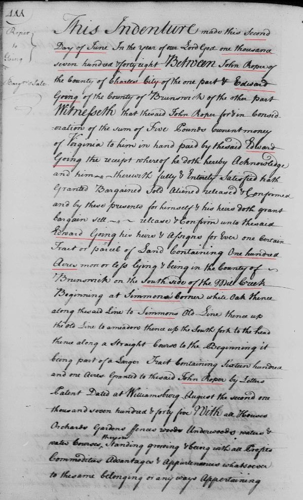 1748 June Ct: An indenture of bargain and sale from John Roper to Edward Going was mov’d by the oaths of the witnesses thereto and ordered to be recorded. Brunswick Co Va, Court Orders v 3 pg 388.