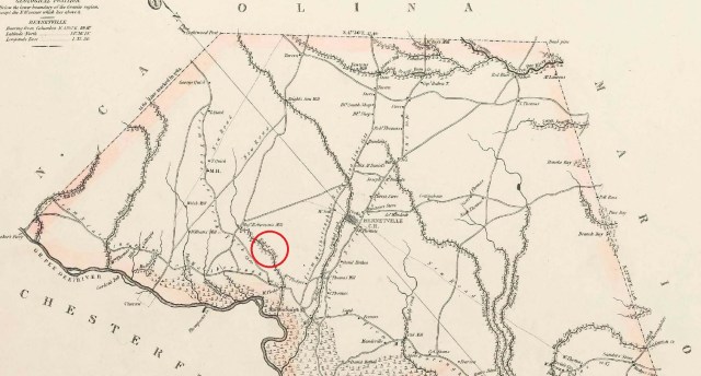 This earlier Basses Mill near Great Pee Dee has been completely forgotten by locals. In fact, little trace of it exists, and was so far back in what is now the boonies that hardly anyone ever passes that way. So whenever someone mentions Basses’ Mill, people now immediately think of the one on Hwy 301, as they have no knowledge of the earlier one on Naked Creek. (Naked Creek, by the way, is not to be found on any map of the area that I have ever seen. The name of the creek has perished along with the memory of Moses Bass’ Mill and public-house. I believe it is the one referred to in later deeds as Basses Creek, which is likewise not to be found on any known map.)