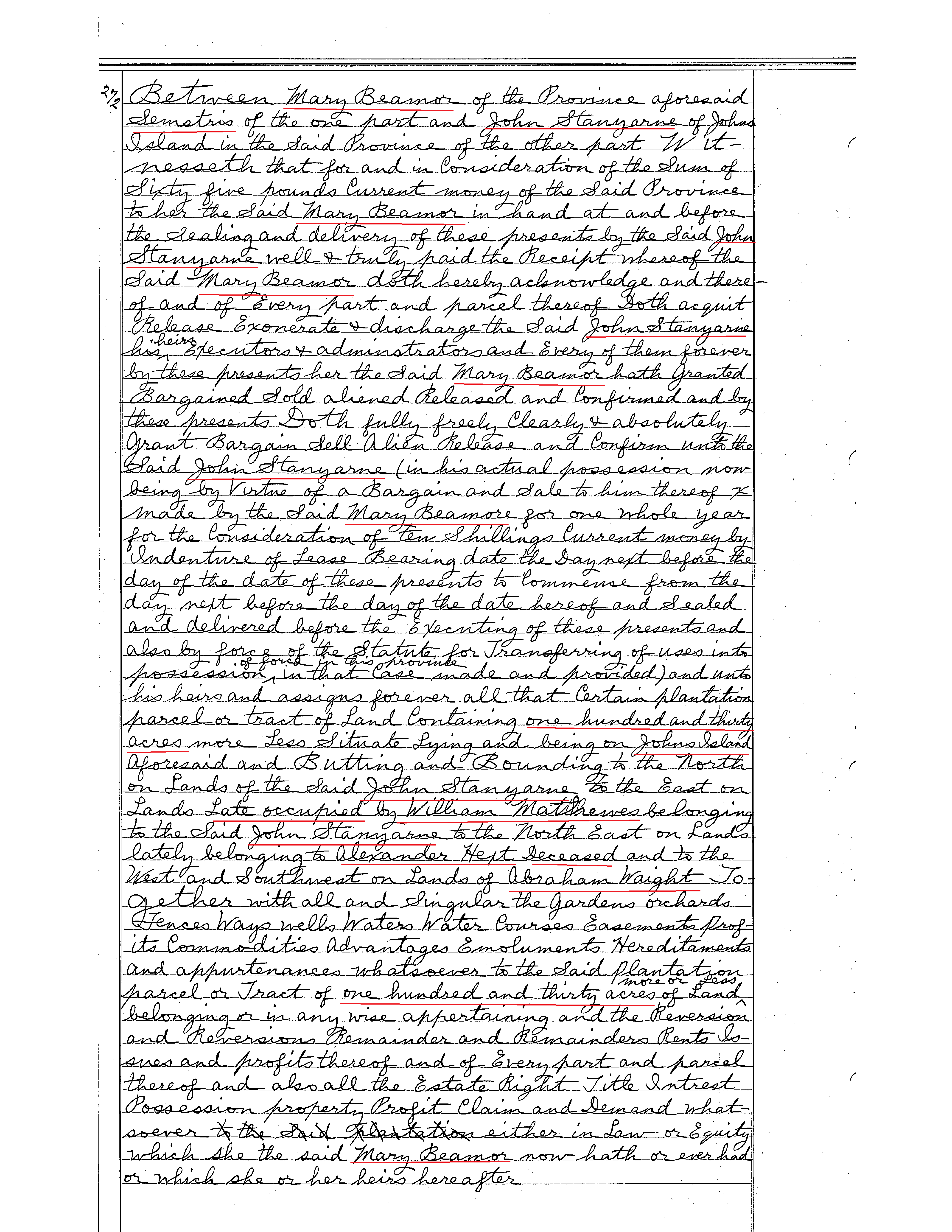 The transaction between John Stanyarne and Mary Beamor was for land described as: Mary Beamor in exchange for payment of 65 pounds by John Stanyarne, Mary Beamor conveys to John Stanyarne 130 acres on Johns Island, bounding land of John Stanyarne, William Mathewes, Alexander Hext decd, Abraham Waight . . . Signed: Mary Beamor. Wits: William Sams, Elizabeth Sams.