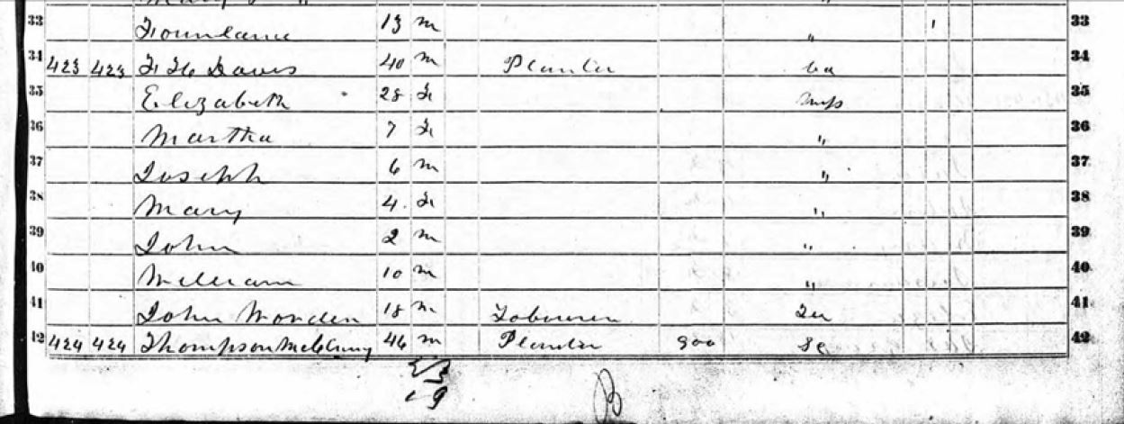 (1850 US Census – Yalobusha County, Mississippi – showing Docia Plaxco age 80 living at Thompson McCluney’s home).
