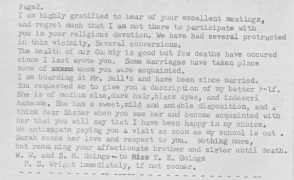 William W. Goyen’s letter dated September 4-9, 1851 addressed again to Adeline McCluney, and to his sister E. T. Going in Oakland, Yalobusha Co, Miss. is below. The letter includes the fact that William W. Goyen has married Sarah Bell some time between the time this letter was written, and the last letter on July 31, 1851. The letter additionally mention cousins John McCluney and Samuel McCluney – also on US Census report above – further confirming these letters are addressed to Thompson McCluney’s household (where grandmother Docia Plaxco / Goyen / Bland was living).
