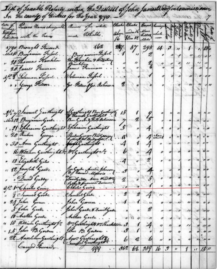 1782 – Joseph Going – head of a household of seven “whites over 16” in the 1782 census of Fairfax County, page 17, according to “Heads of Families, Virginia, 1790.” Fairfax Co., Va. 1782 – “Joseph Going” (?) Joseph Going – head of a household of seven “whites over 16” in the 1782 census of Fairfax County, page 17, according to “Heads of Families, Virginia, 1790.” Fairfax Co., Va. 1782 – Joseph Going – Virginia Census – head of a household of seven “whites over 16” in the 1782 census of Fairfax County, page 17, according to “Heads of Families, Virginia, 1790.” 7 whites, no blacks in household. Fairfax Co., Va.