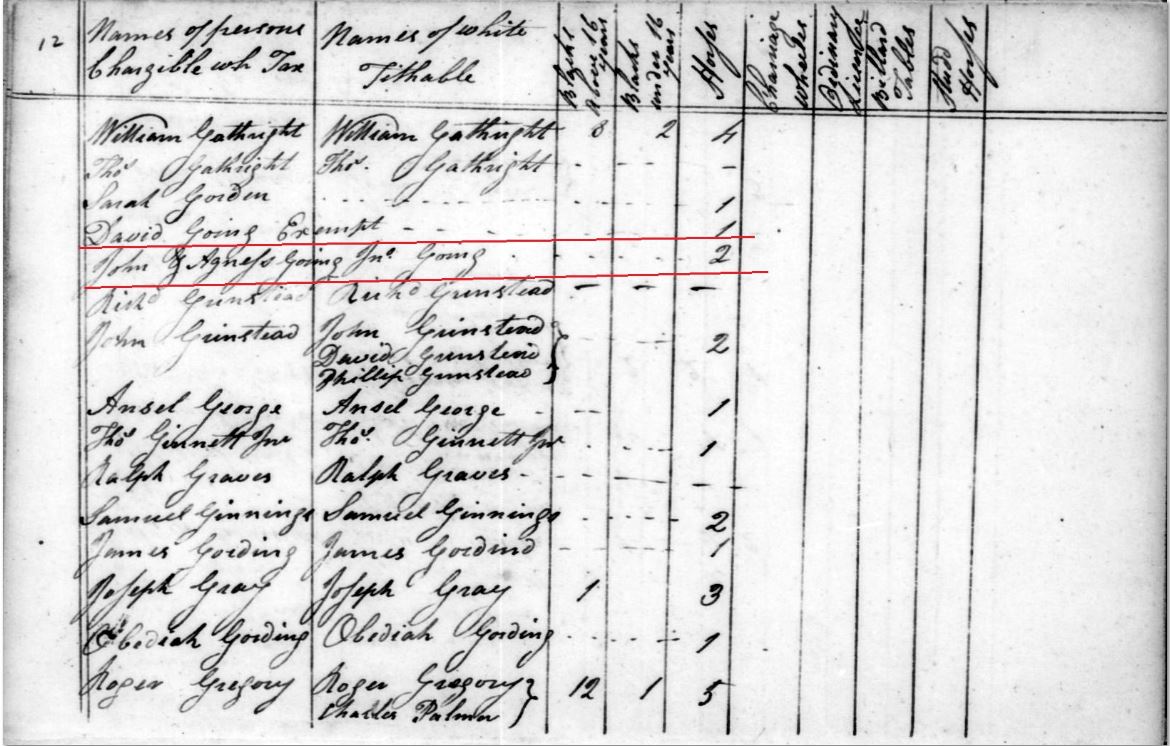 1789 May 29 – Joseph Going with J. Going & Jno. Going on list – 2 white tithes, 2 horses.