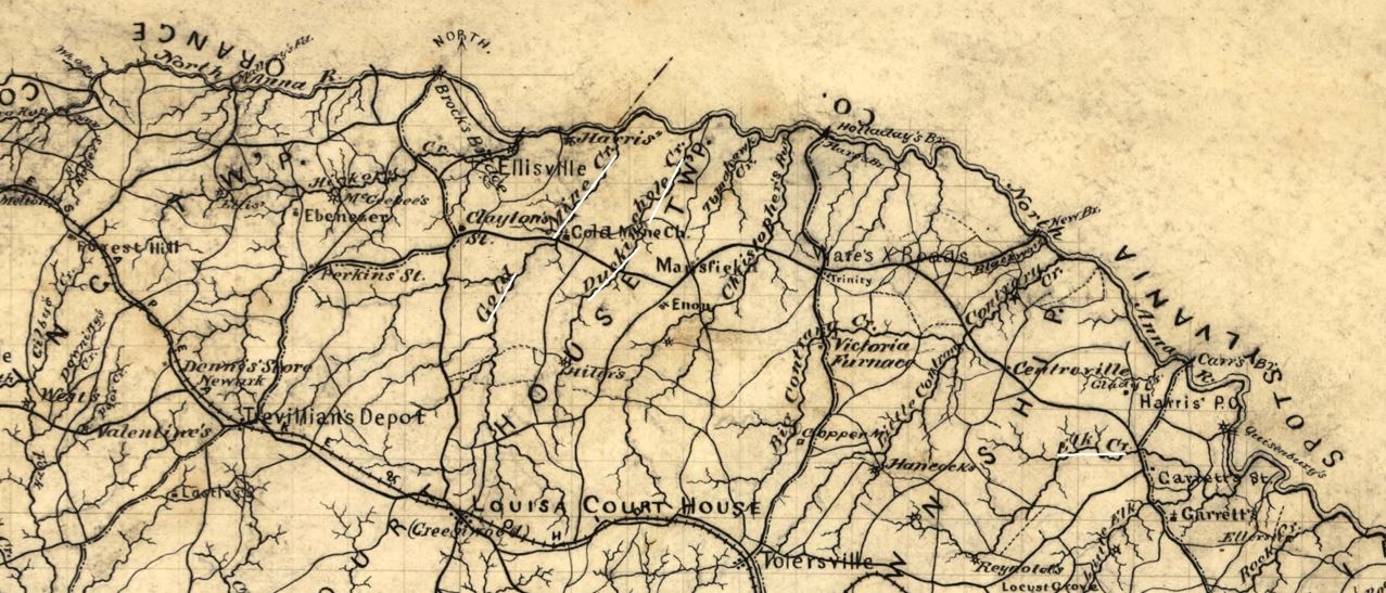 The following entries in 1760 and 1764 are where Adam Chisholm witnesses deeds located on Gold Mine Creek and Duckinghole Creek in Louisa County, Virginia. This area is marked on the map below in the northern part of Louisa County.