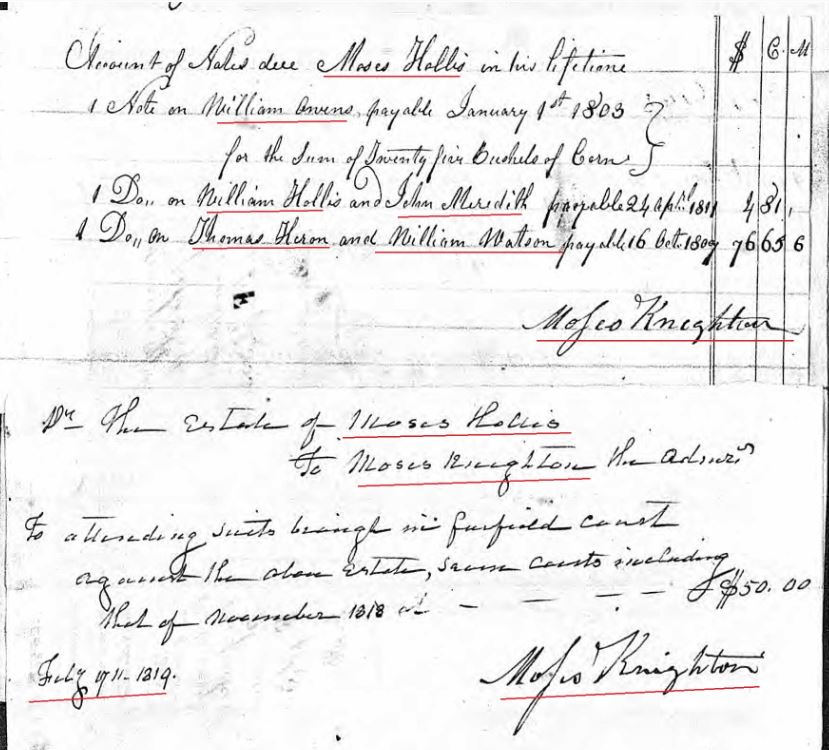 Likely siblings: (The following two names are listed on Sarah Hollis’ probate papers as her “heirs” receiving an equal share as her other children in probate. This likely means that James Hollis Sr and Sarah Hollis had their own children named John and Moses. These would appear to be a different set of John and Moses Hollis than Moses Hollis and Catherine Hollis’ children – so look for two different John and Moses about the same age as they are cousins likely living nearby or living in the same areas).