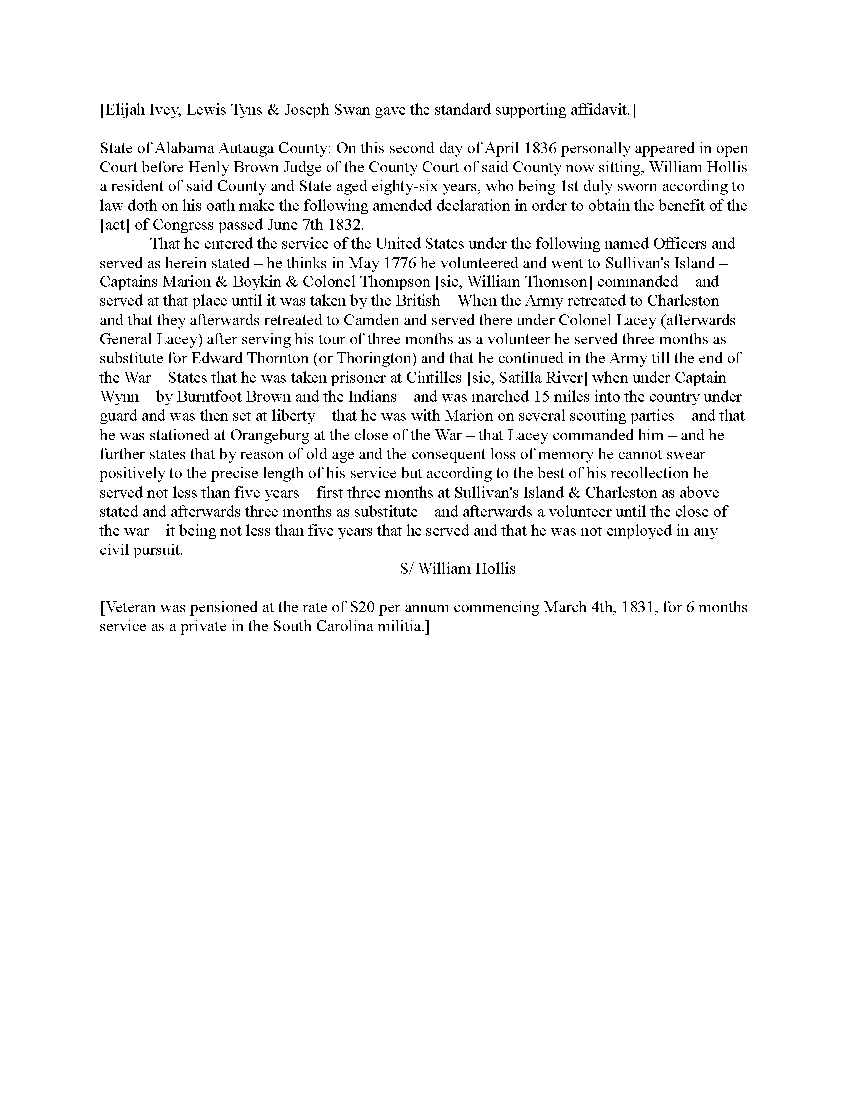 State of Alabama Autauga County: On this second day of April 1836 personally appeared in open Court before Henly Brown Judge of the County Court of said County now sitting, William Hollis a resident of said County and State aged eighty-six years, who being 1st duly sworn according to law doth on his oath make the following amended declaration in order to obtain the benefit of the [act] of Congress passed June 7th 1832.