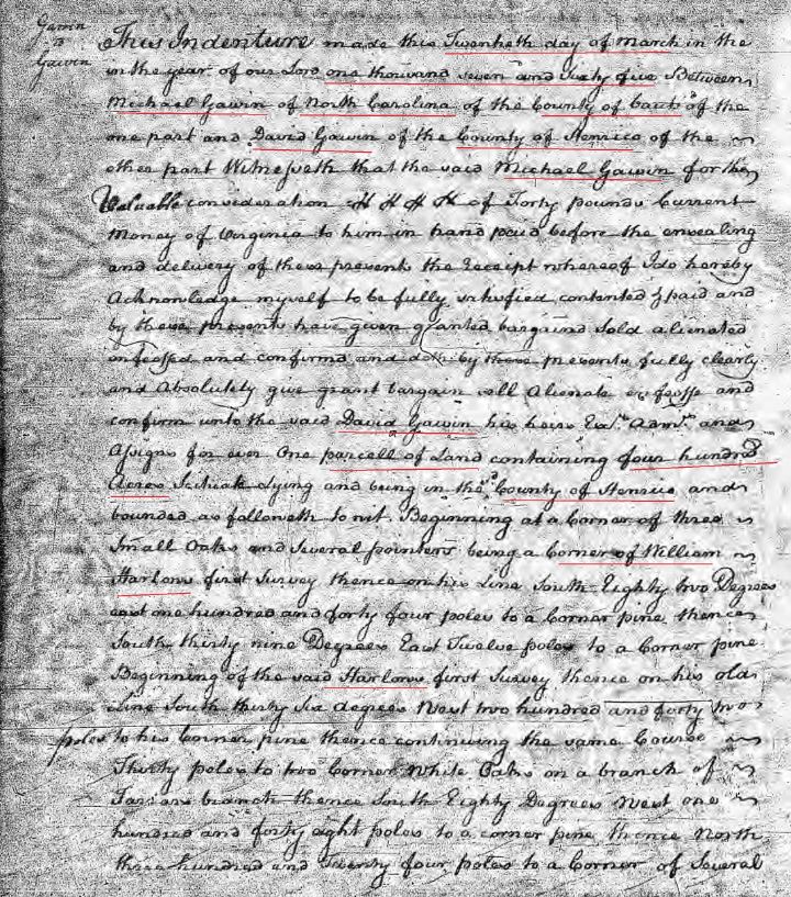 … between Michael Gawin of North Carolina of the County of Bute of the one part and David Gawin of the County of Henrico of the other part … Michael Gawin for the valuable consideration … of 40 pounds … confirm unto the said David Gawin … one parcel of land containing 400 acres situate lying and being in the County of Henrico and bounded … corner of three small oaks and several pointers being a corner of William Harlows first survey …