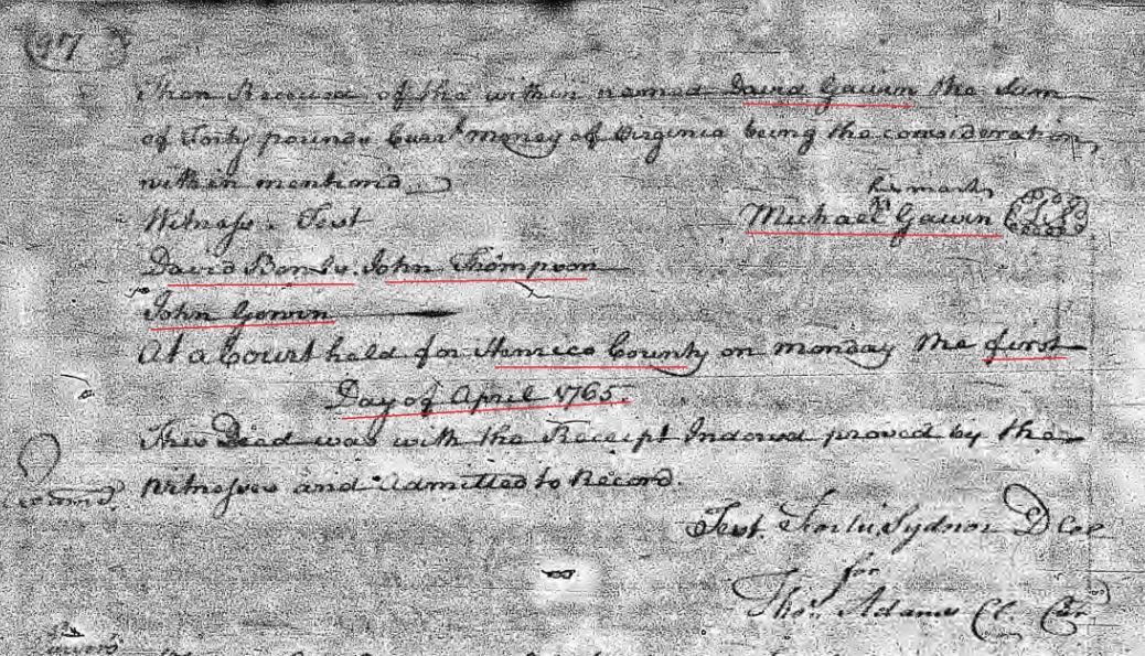 1765 March 20 – Michael Gawin of Bute Co, NC 400 acre deed to David Gawin of Henrico Co, Va.