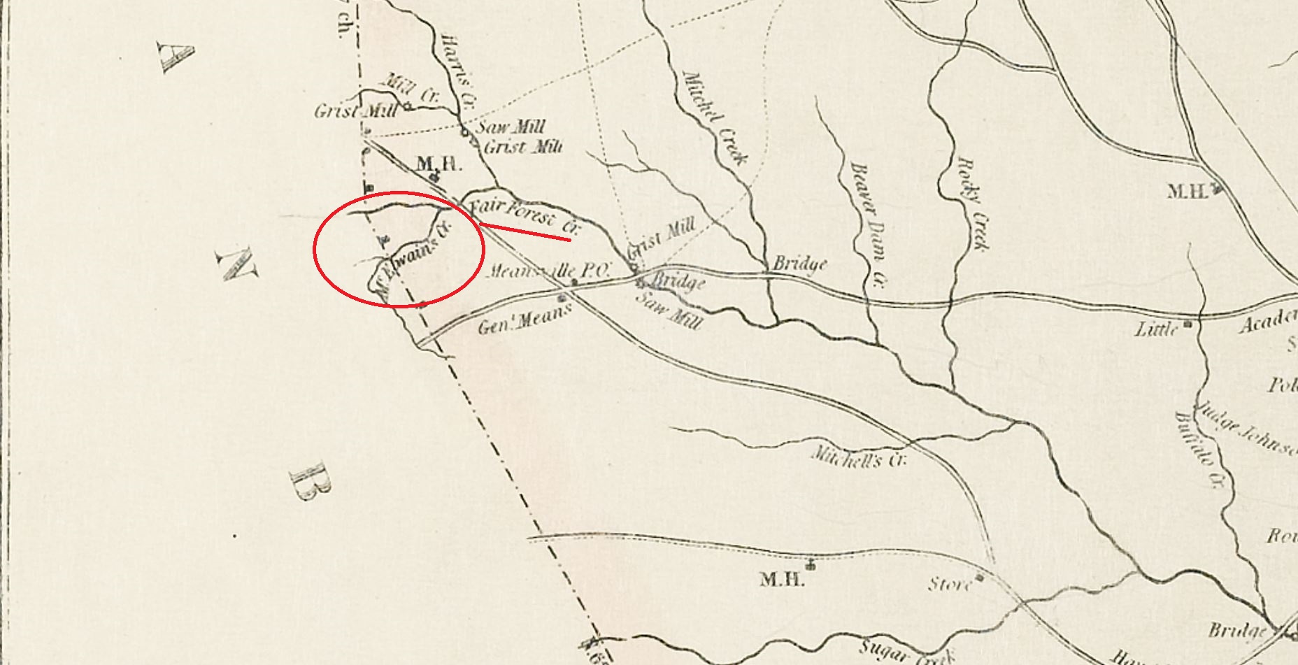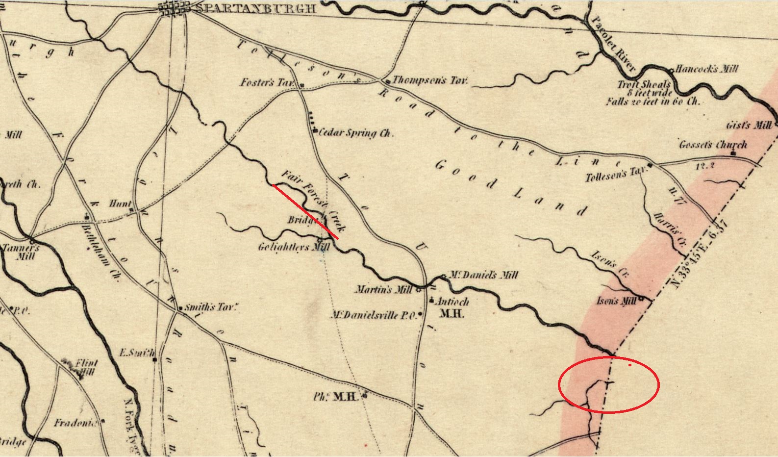 The survey shows that the land is next to Fairforest Creek. Fairforest Creek starts at the Tyger River in the Southern portion of Union County, South Carolina and runs north and west into Spartanburg County, South Carolina – continuing up to just South of the City of Spartanburg. The maps below show the area in Spartanburg that appears to be marked on the survey.