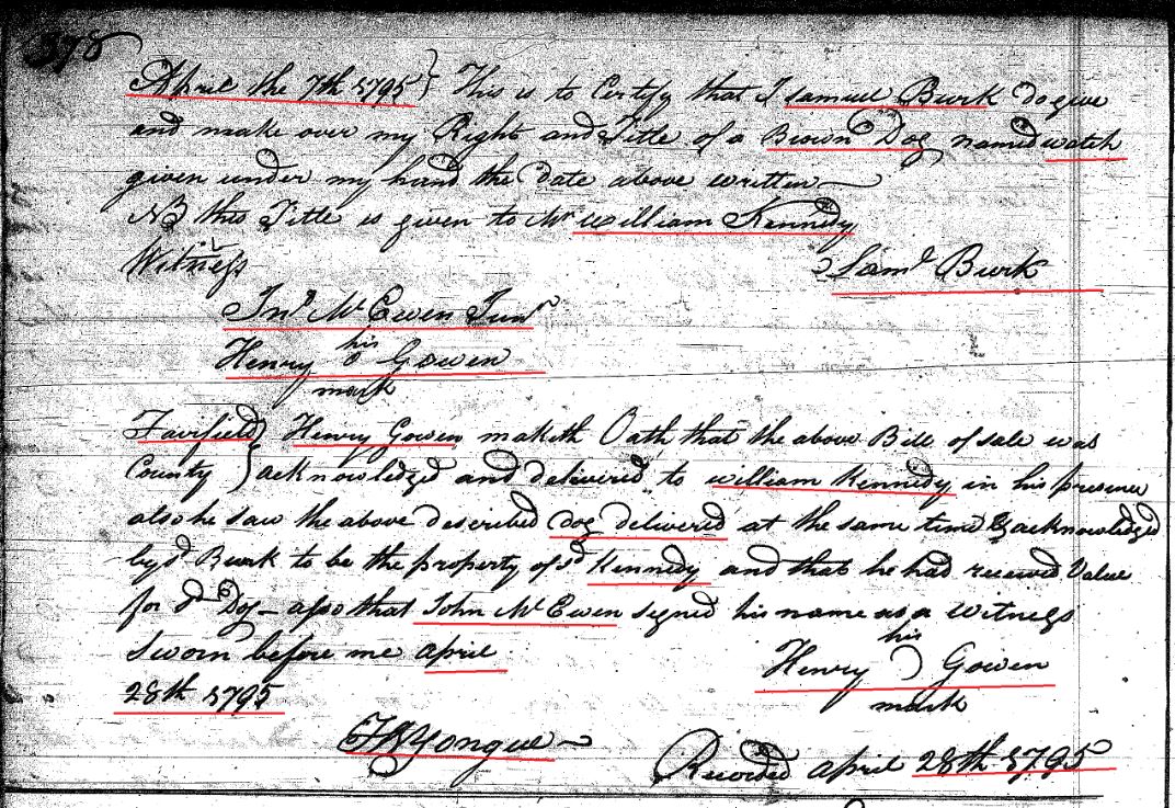 On April 28, 1795, Fairfield County, SC Deedbook I, pg 378 records Samuel Burk conveying a brown dog named “Watch” to a William Kennedy. Witnesses were: John McEwen Jr, and Henry Gowen. Henry Gowen proved up the document at court. Fairfield SC.