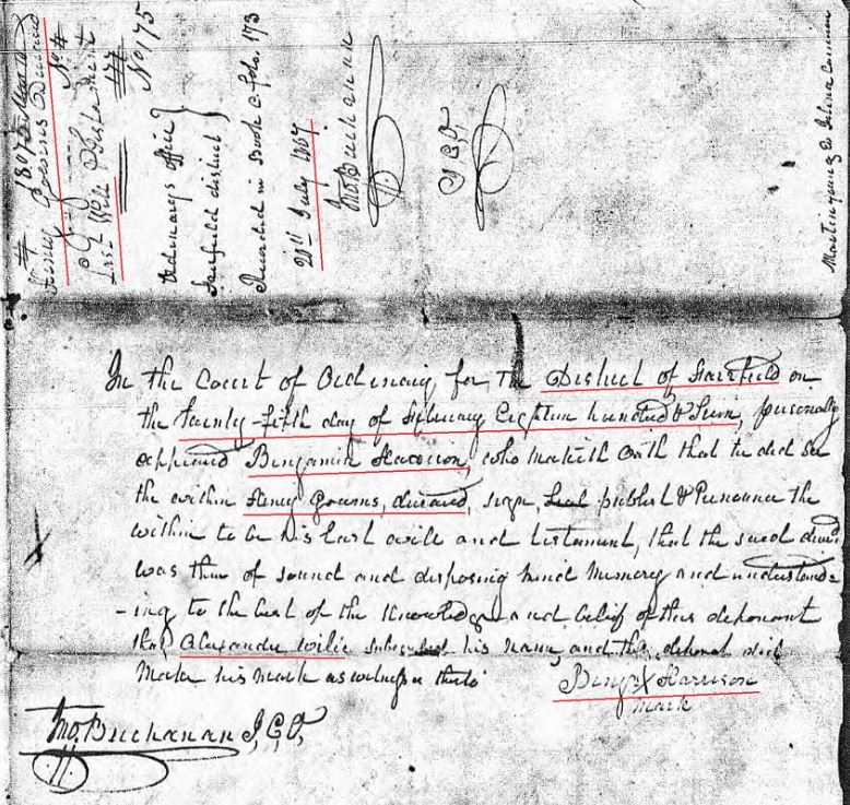 Benjamin Harrison helps prove up Henry Gowins will by swearing he saw him sign, and that he also saw Alexander Wilie (Wylie) sign as a witness, as well as himself sign as a witness to the will in 1807.