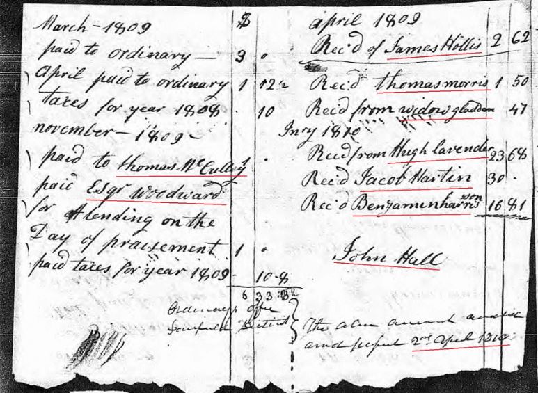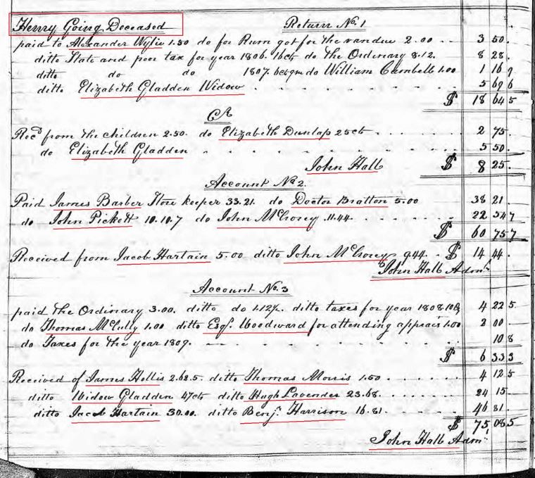 The April 2, 1810 return with the court shows the Estate of Henry Going paid out to Thomas McCulley and Esqr Woodward, the estate received payments from James Hollis, Thomas Morris, widow Gladden, Hugh Lavender, Jacob Hartin, and Benjamin Harrison. Signed by John Hall.