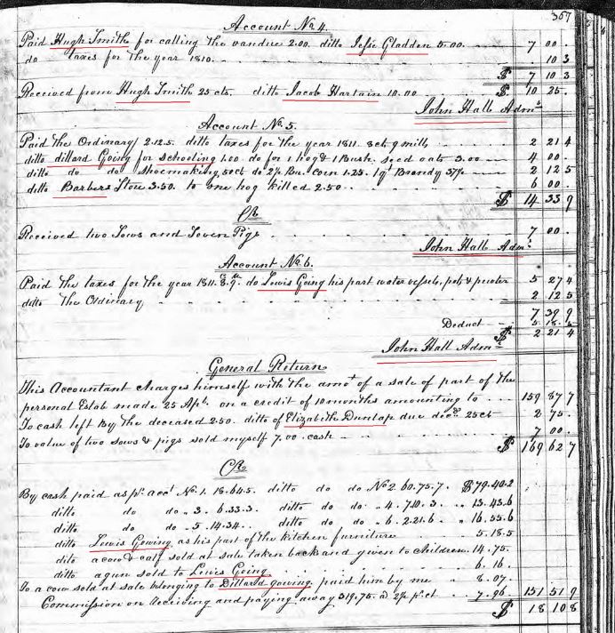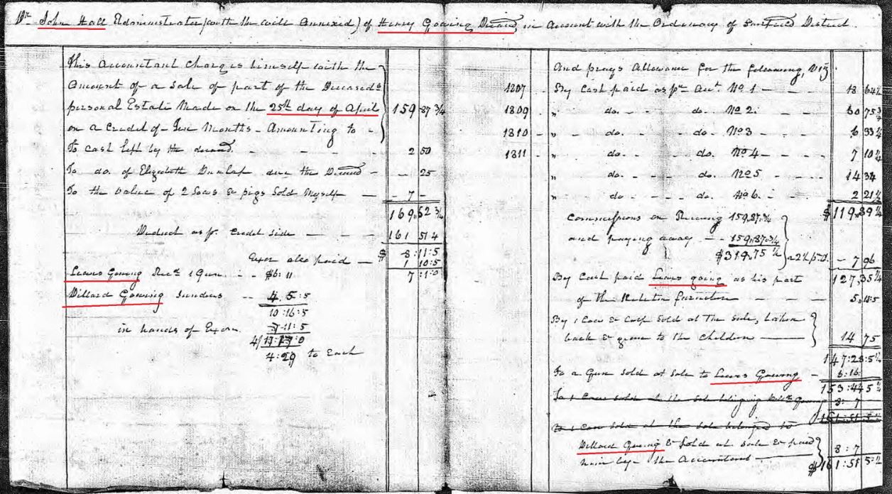 John Hall noted as administrator of Henry Going’s estate, and payments to Elizabeth Dunlop, Lewis Gowing, and Dillard Gowing are noted on the 1807-1811 return above.
