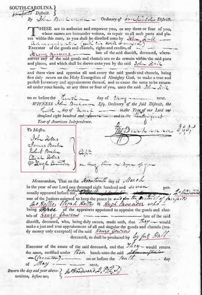 March 17, 1807, the Fairfield County, SC Court ordering John Hollis, James Barber, Robert Barber, Elijah Hollis, and Hugh Lavender to appraise the estate of Henry Gowins, decd, and to give the return to the administrator, John Hall so he can file with the court.