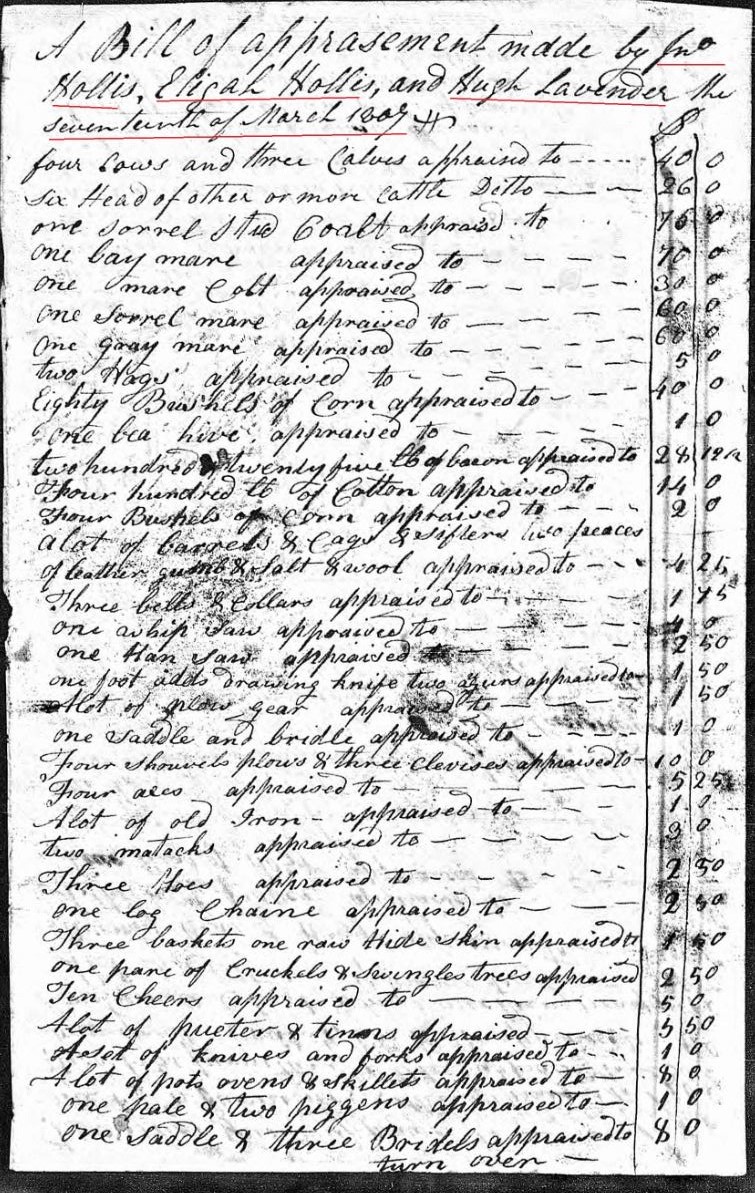 Appraisers: John Hollis, Elijah Hollis, Hugh Lavender