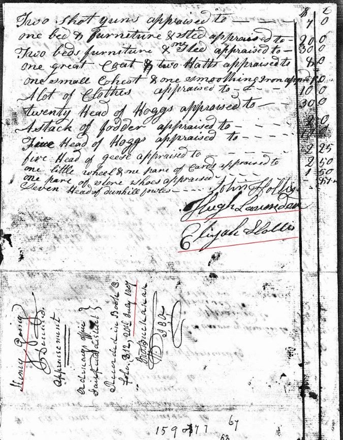 July 20, 1807, the return for the appraisement of Henry Going’s estate is filed in the Fairfield County, SC court – signed by John Hollis, Hugh Lavender, and Elijah Hollis.