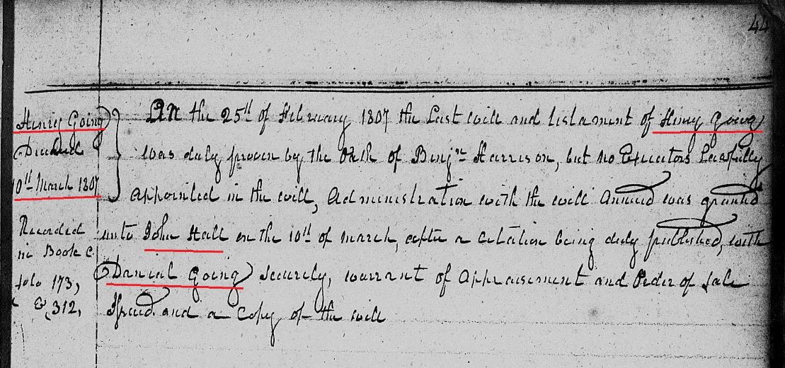 February 12, 1807 – Henry Going’s will is proved up in court: