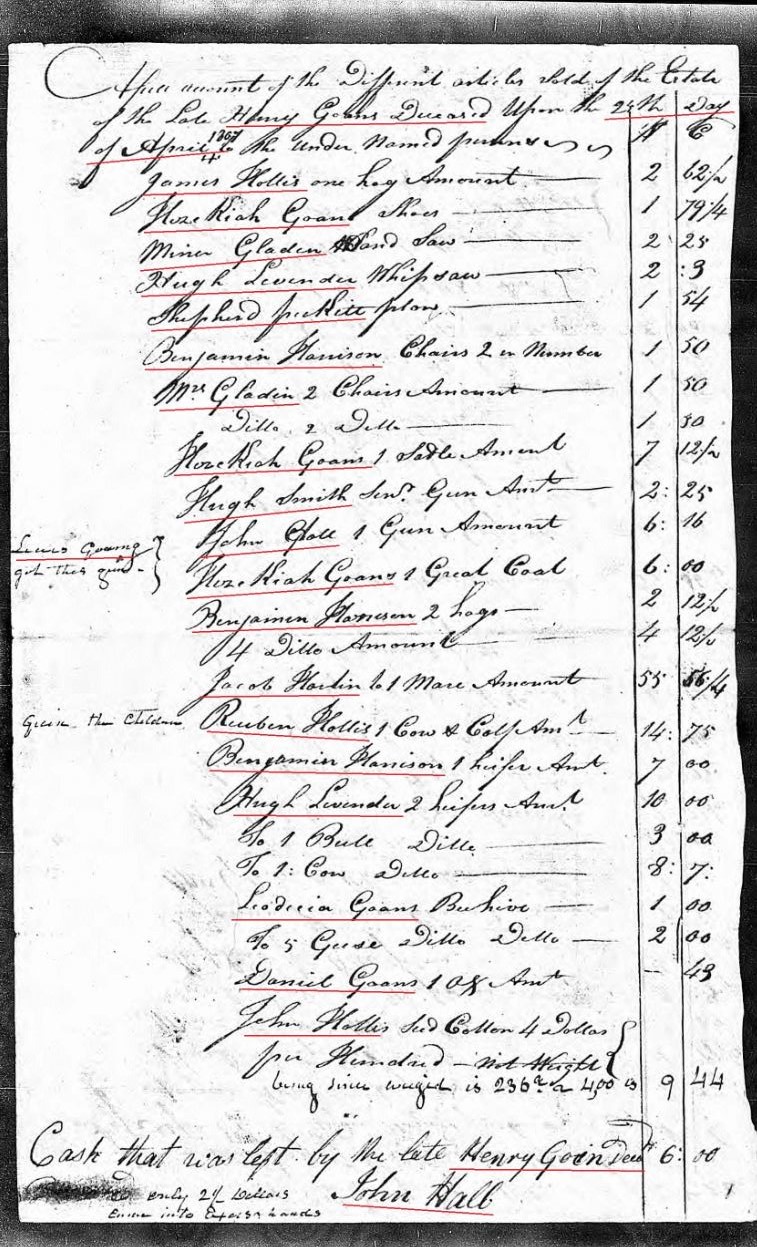 April 24, 1807 the return for Henry Going, dec’d estate sale is filed with the Fairfield County, SC court.