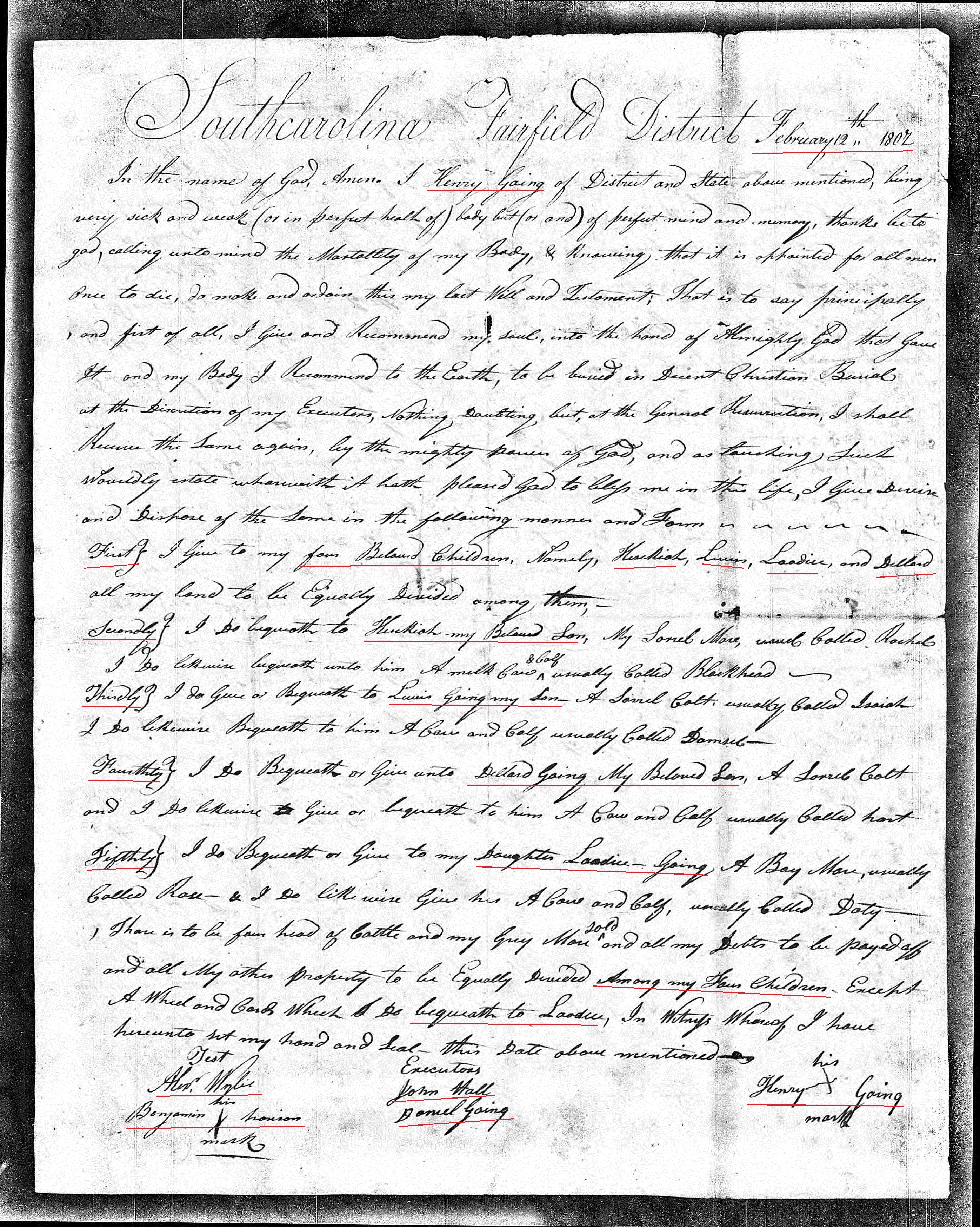 Daniel Going, one of the executors, is likely the brother to Henry Going. Benjamin Harrison, one of the witnesses to the will, was married prior to 1810 to “Polly Gowens, daughter of Daniel Gowens,” according to “Fairfield County, South Carolina Marriages Implied in Probate Records, 1775-1879” with reference to Apartment 49, File 755.