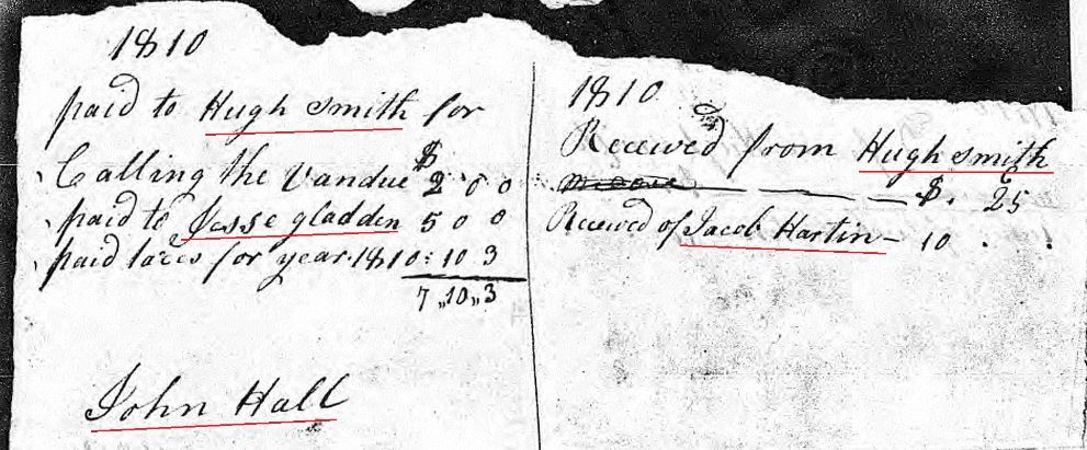 Another 1810 return for Henry Going’s estate shows payments to Hugh Smith, and Jesse Gladden, and payments received from Hugh Smith and Jacob Hartin. Signed by John Hall.