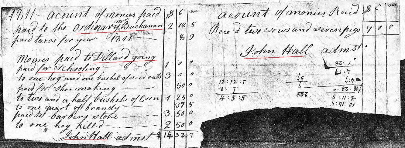 An 1811 return filed with the Fairfield Co, SC court for the Estate of Henry Going shows payments to Dillard Going for schooling. Signed by John Hall, admst.