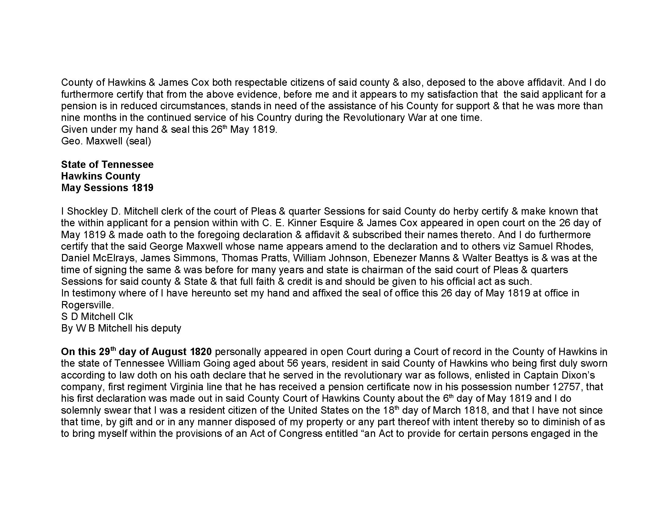 Hawkins Co, Tenn (residence when applied for pension in 1819)