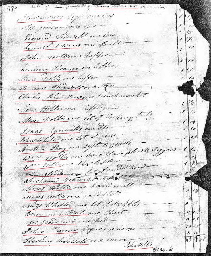 1794 Moses Hollis Sr’s probate loose ppw 7 inventory sale showed the following buyers at his estate: John Hollis, Elijah Hollis, Littleton Isbell, Wm Evins, James Hollis,Berryman Hollis, Peter Patterson, Thomas Hughs, Burrel Gibson, Dix Tidwell, Lemuel Owen, Jesse Gladden, Hugh Brown, Moses Hollis, Rosannah Hollis, George Lott, John Turner, Edmond Tidwell, Limery Strange, Lemon Tidwell, Charles Johnston, Isaac Reynolds, John Mcliled, Austin Peay, William Hollis, John Gladden, Abraham Gibson, Naze Whetted, Joseph Goodrum, and Sterling Tidwell.