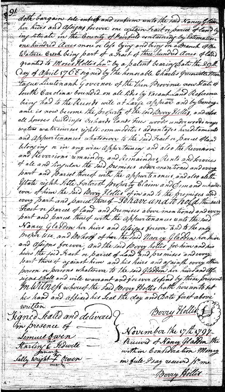 On July 11, 1797 Berry Hollis conveyed 100 acres of land on Wateree Creek in Fairfield County to Nancy Gladden, it was part of the 300 acre tract granted to Moses Hollis Sr in 1768. The conveyance was witnessed by Sterling Tidwell, Sally Wright Owen, and Lemuel Owen.
