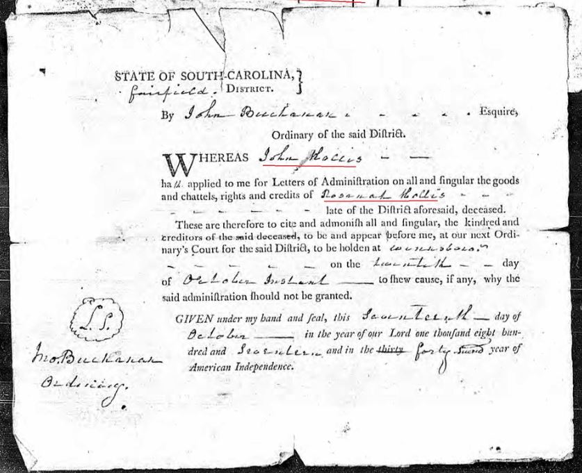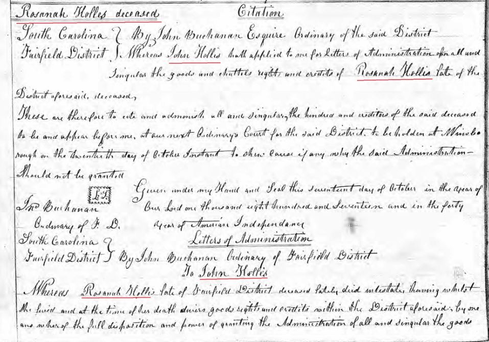 On October 20, 1817 John Hollis applied for Letters of Administration of Rosannah Hollis’ estate, with the Fairfield District Court in South Carolina.