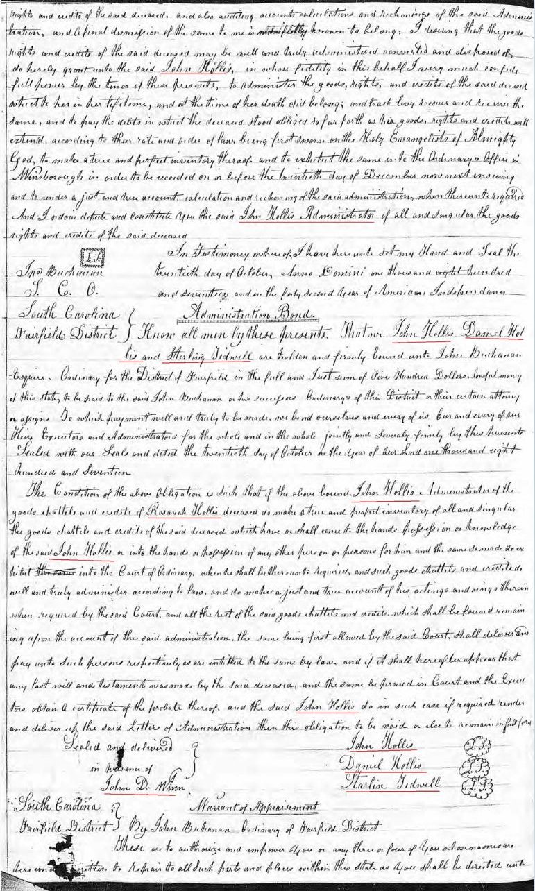 The Fairfield District Court noted in its records, that on October 17, 1817 John Hollis was issued letters of administration of Rosannah Hollis’ estate, and that bond had been posted, and notes entered into the court’s book in the Fairfield District Court in South Carolina.