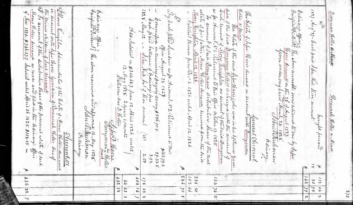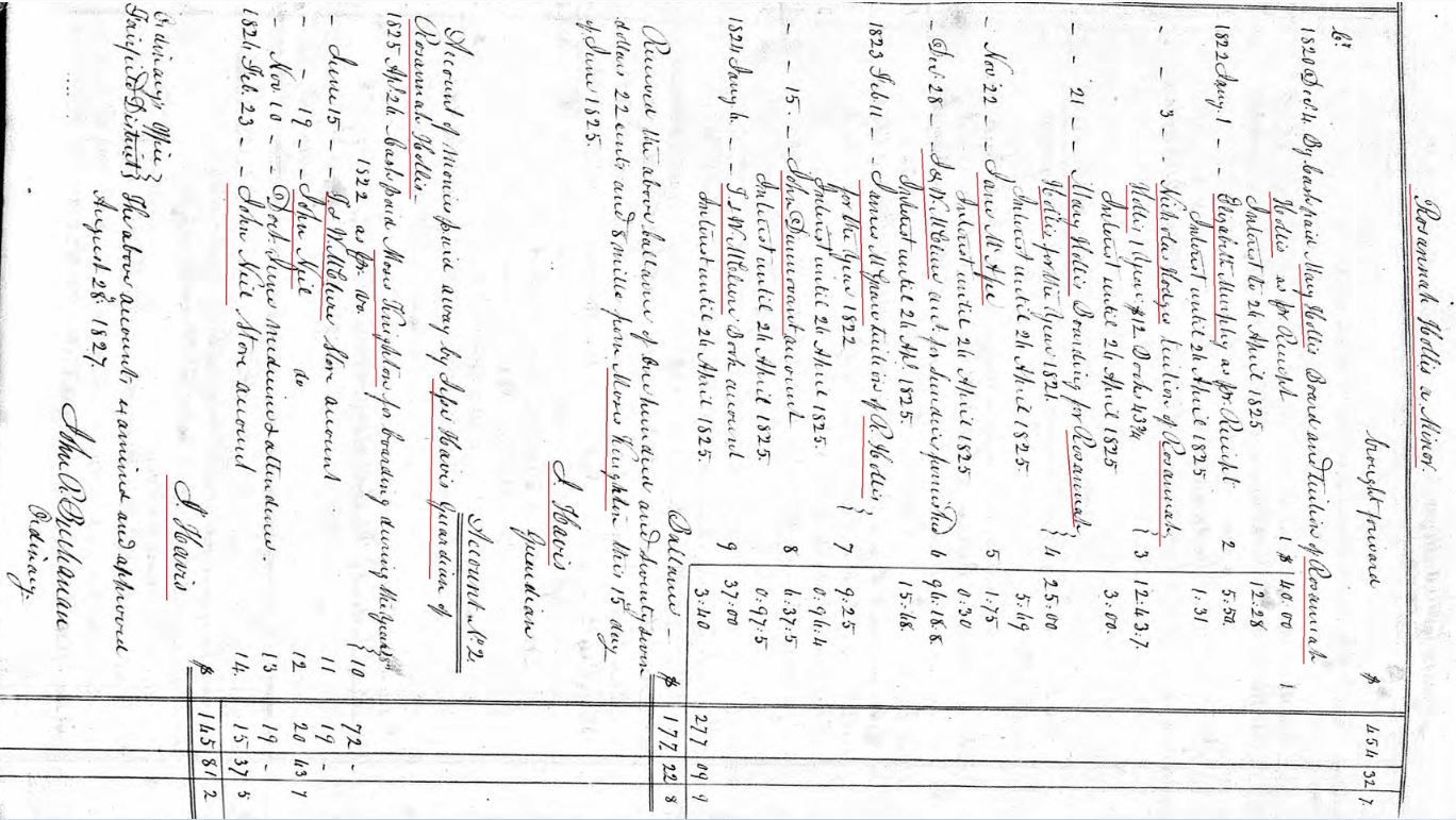 In January 1827, a final accounting was filed in Rosannah Hollis’ estate by John Hollis the administrator.
