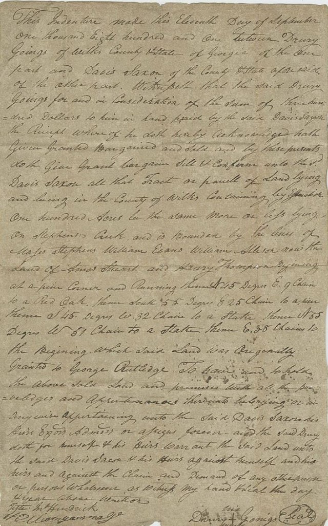 On September 11, 1801 “Drury [X] Goings” sold his 100 acres on Stephen’s Creek to David/Davis Saxon for $300. John Hendrick and William Gammage witnessed the deed which was proved September 30, 1805, according to Wilkes County Deed Book VV, page 365. http://vault.georgiaarchives.org/cdm/compoundobject/collection/wccr/id/4640/rec/15