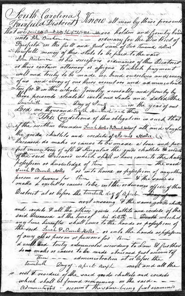 1802 Jan 20 Sarah Hollis, Burrell Hollis, John Dunlap, and William Hollis posted bond on James Hollis‘ estate in Fairfield Dist, SC.