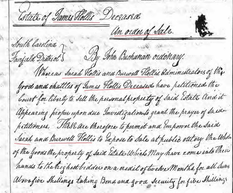 1802 Jan 20 the Fairfield Dist Ct issued An Order of Sale to Sarah Hollis and Burwell Hollis regarding the estate of James Hollis, decd.