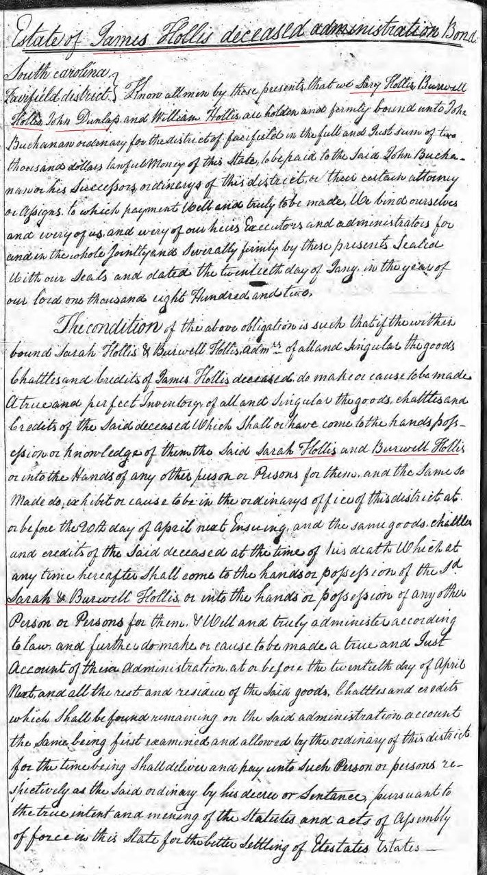 1802 Jan 20 Sary Hollis, Burwell Hollis, John Dunlap, and William Hollis posted an Administrative Bond on James Hollis, decd’s estate in Fairfield District, South Carolina.