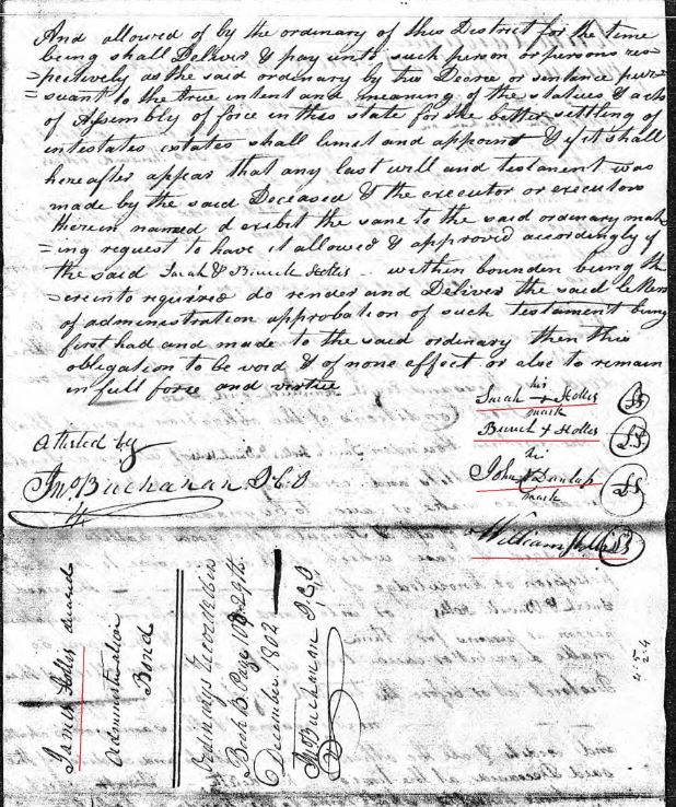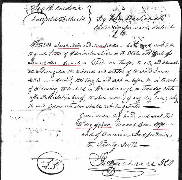1802 Jan 20 Sary (Sarah) Hollis and Burwell (Burrell) Hollis received Letters of Administration on James Hollis‘ estate in Fairfield Dist, SC.