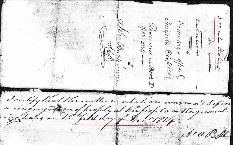 1814 Dec 1 Sarah Hollis decd estate, widow of James Hollis probate 4 citation return by Asa Bell.