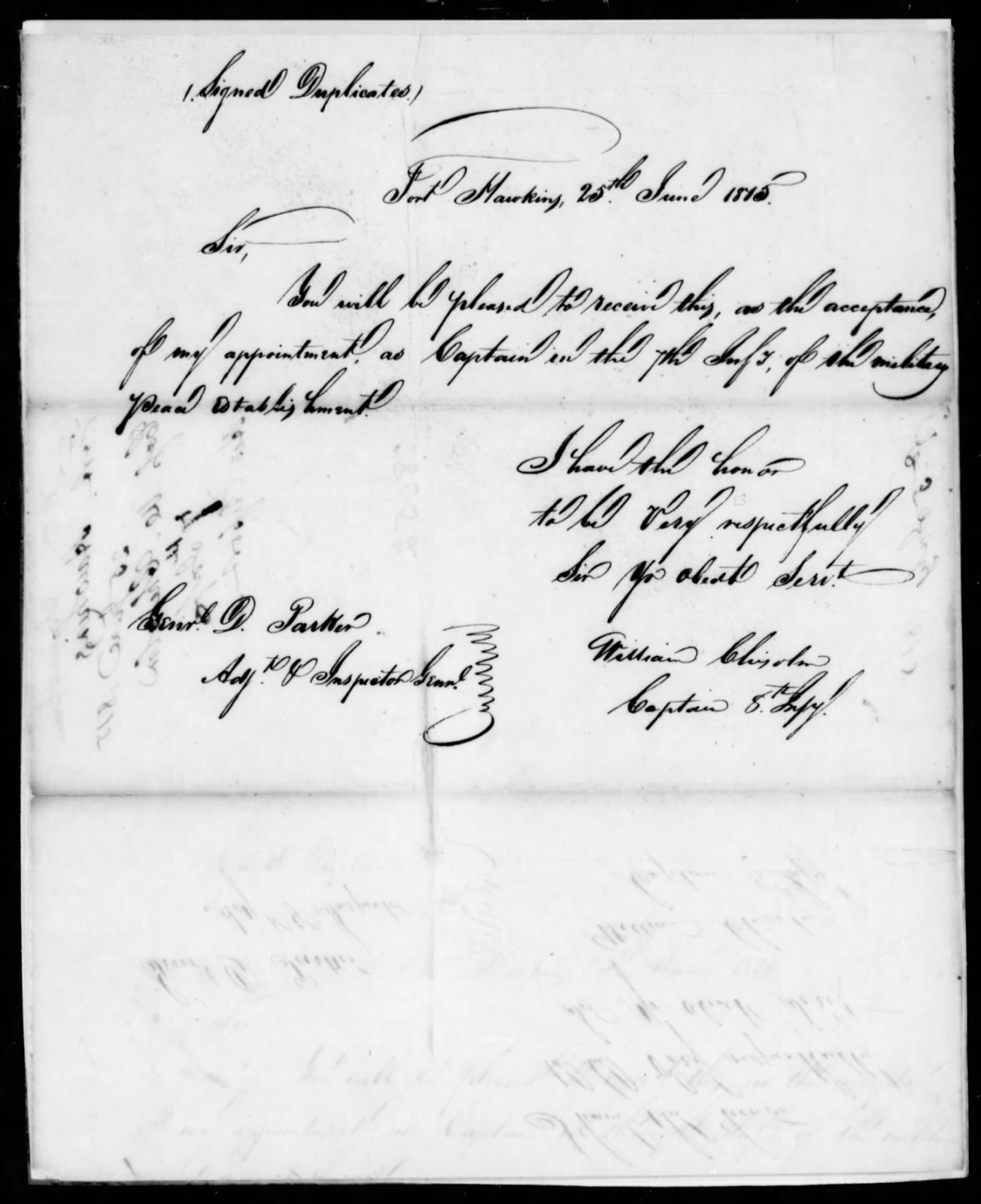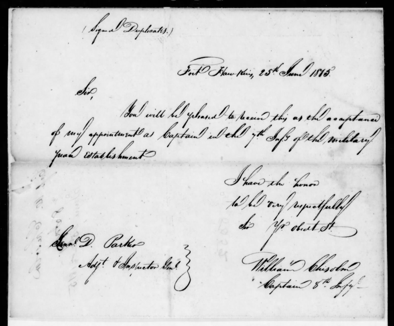 1812 Apr 3 – 1814: Capt. William Chisolm correspondence accepting appointment as Captain of Infantry and waiting for orders in Elbert County, Georgia. Letters Received By The Office Of The Adjutant General, 1805-1821