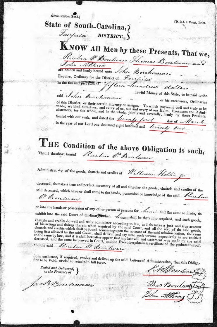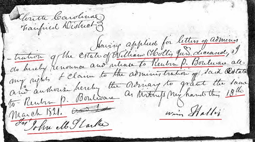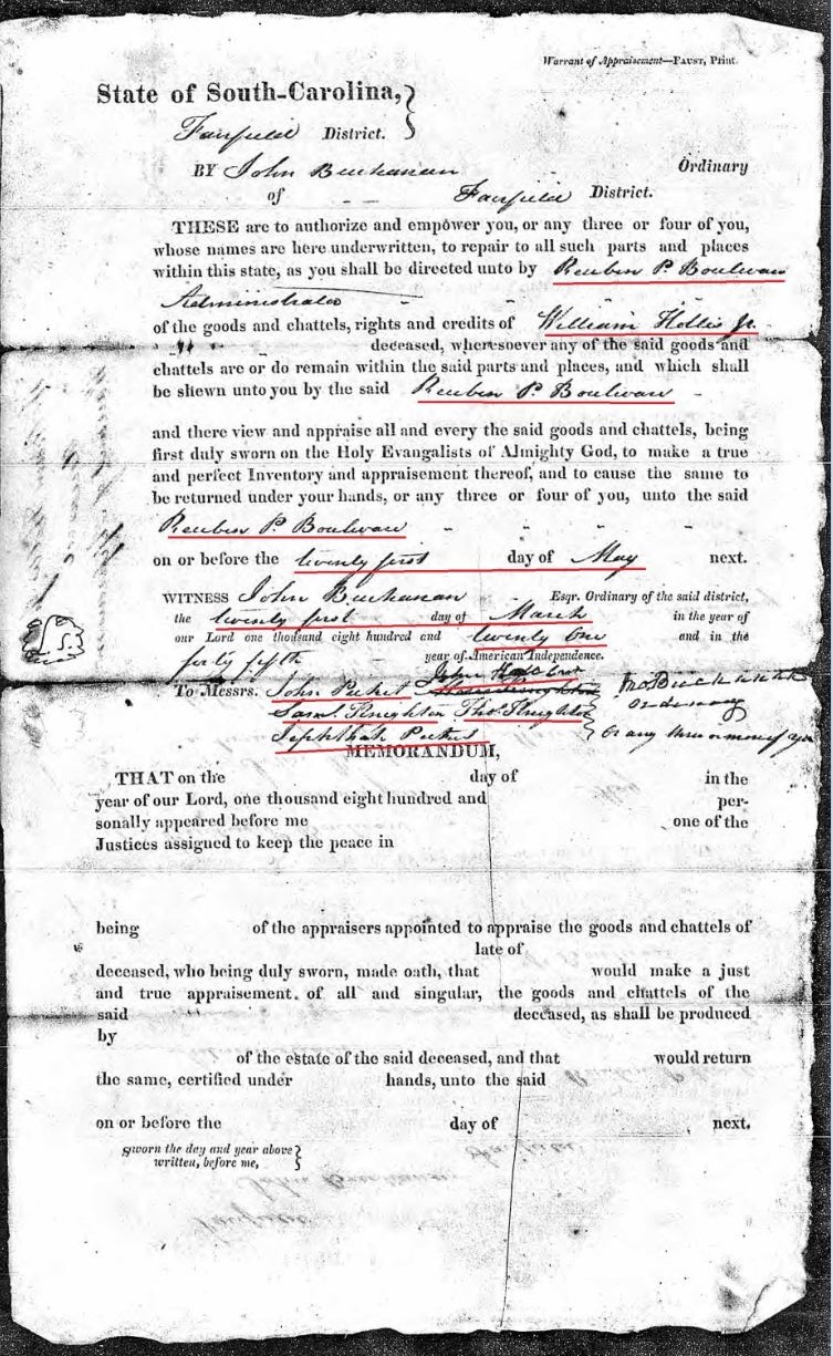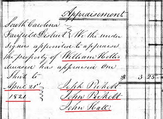 On March 10, 1821, William Hollis Sr applied for Letters of Administration for William Hollis Jr in the Fairfield District, South Carolina.