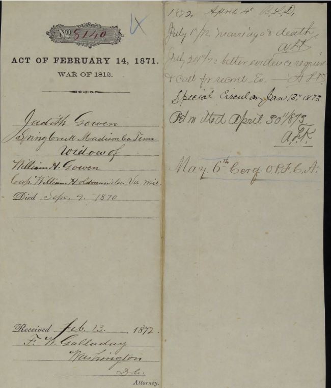 (The following selected page from Fold3’s War of 1812 Pension Applications shows the family bible that was filed by widow Judith Harris Atkisson Gowan showing their wedding date, birth date of William H. Gowan, and their children and their dates of birth: https://www.fold3.com/image/1/313423600 ).