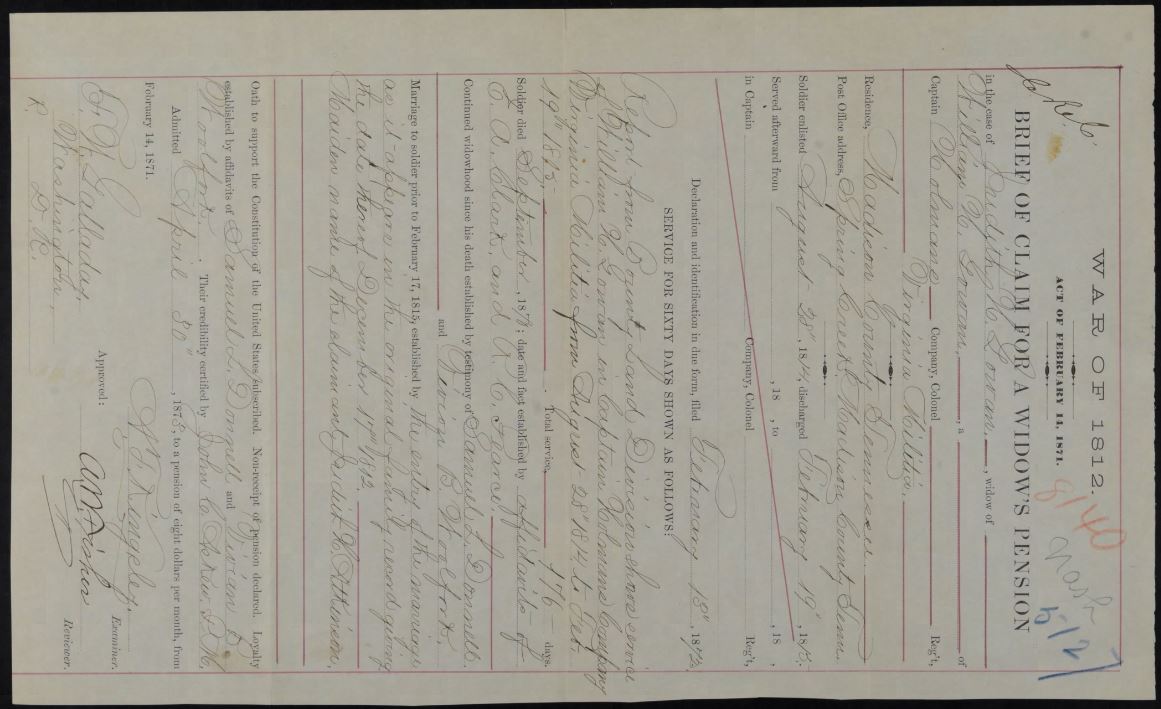 (Click Images below to enlarge – Select pages from Fold3’s War of 1812 Pension Applications – including widow’s application: https://www.fold3.com/image/1/313423600 ).