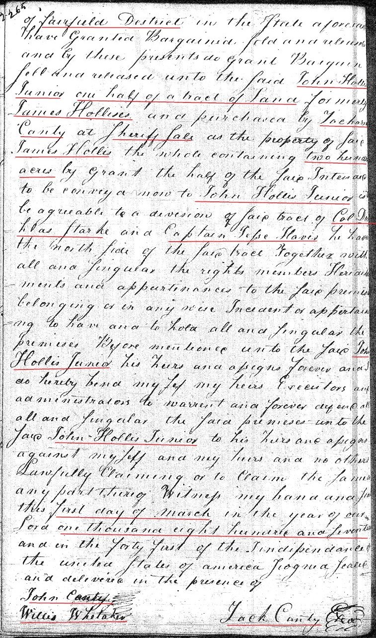 March 1, 1817 General Zachaiah Canty of Kershaw District conveys to John Hollis Jr of Fairfield District a half tract of land formerly owned by James Hollis, the purchased by Zachariah Canty at a Sheriff’s sale, containing 200 acres. Witnessed by John Canty and Willis Whitaker.