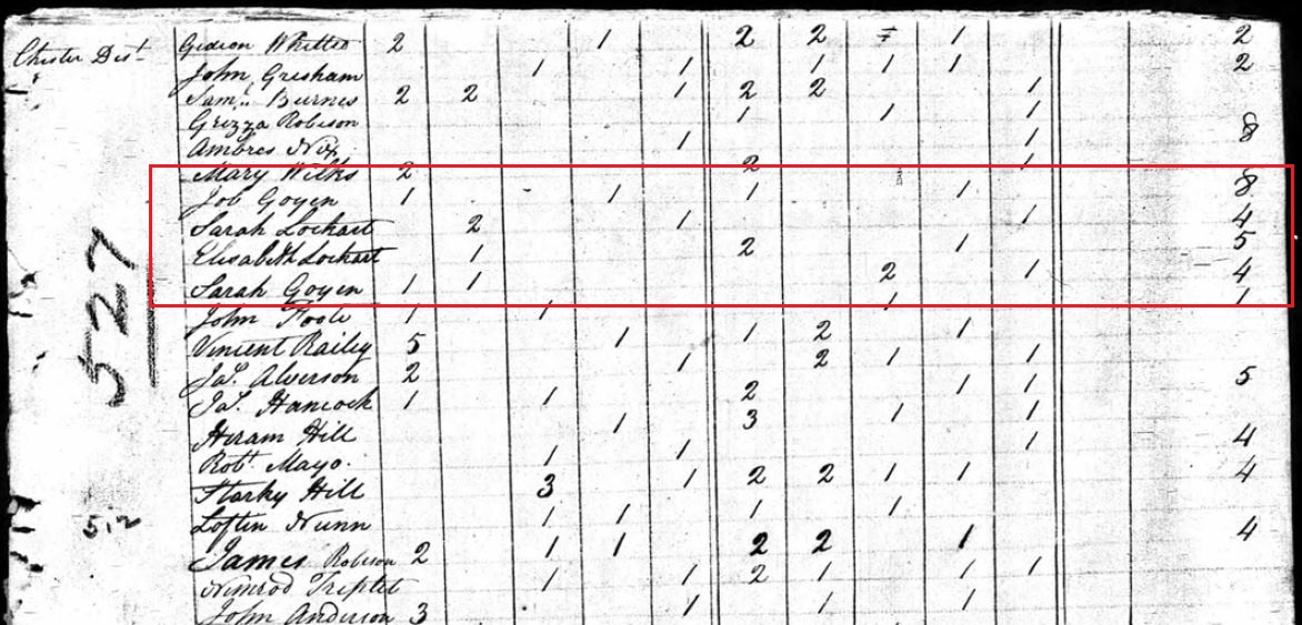 1 male 0-10 yrs = Drury B. Goyen 9 yrs old b. 1800 (Sarah’s grandson from Elijah)
